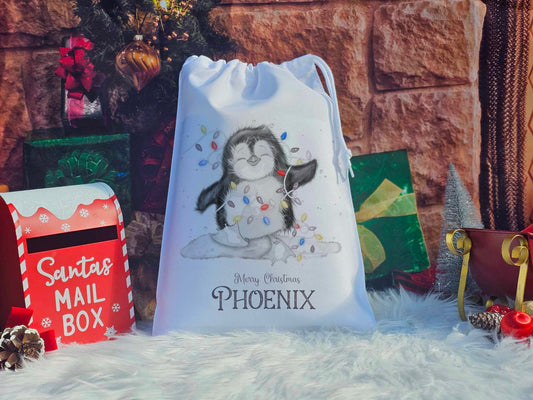 Personalised Penguin Fairy Lights Christmas Eve Sack