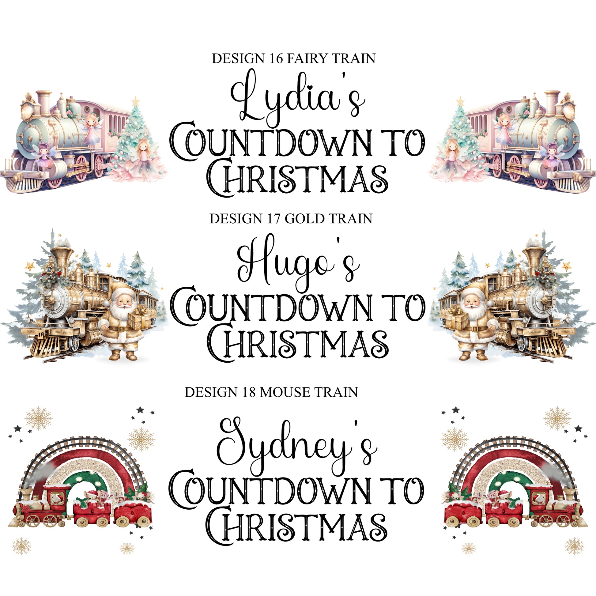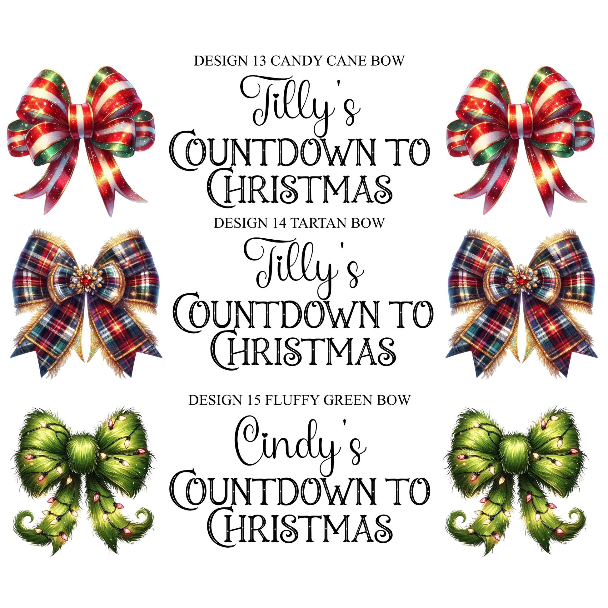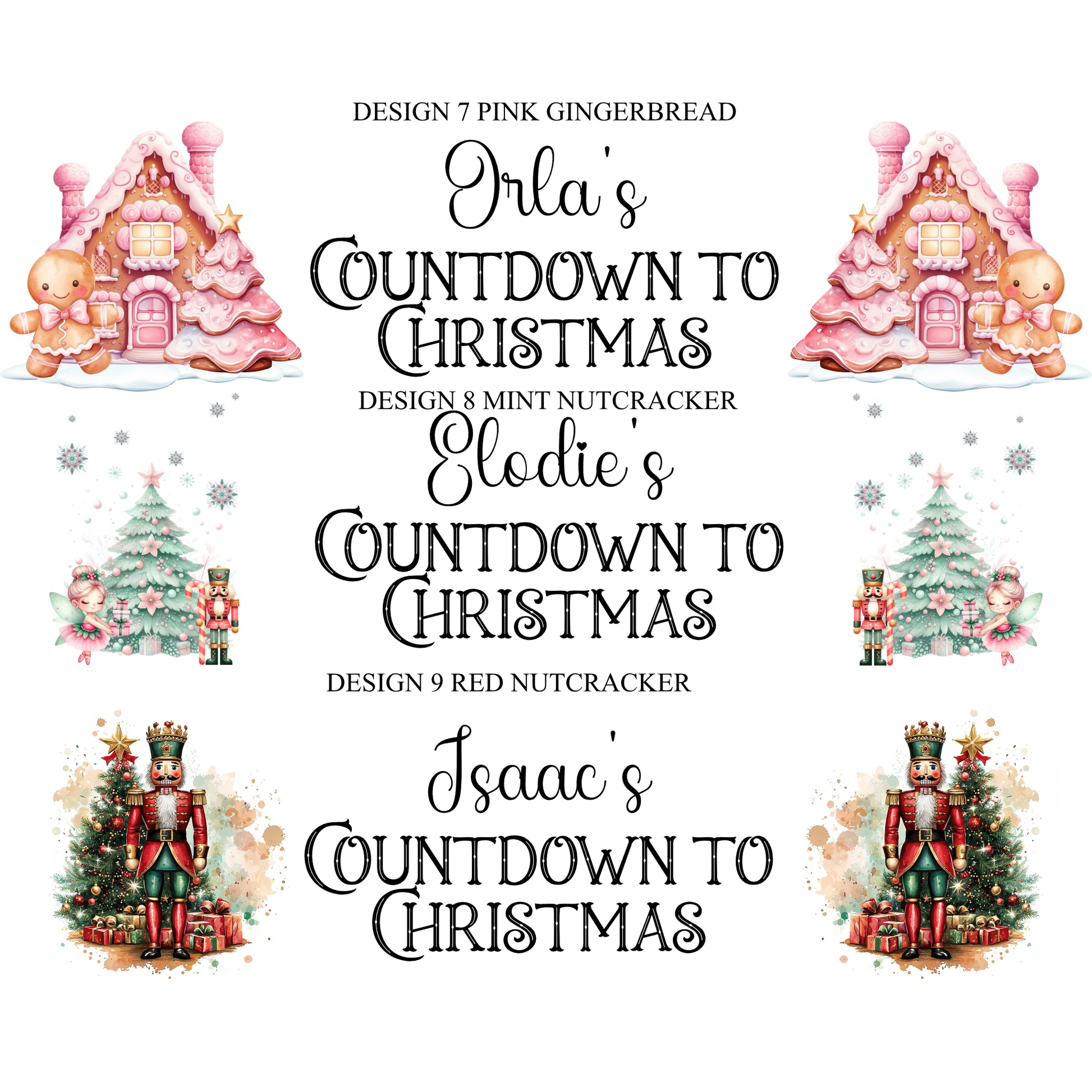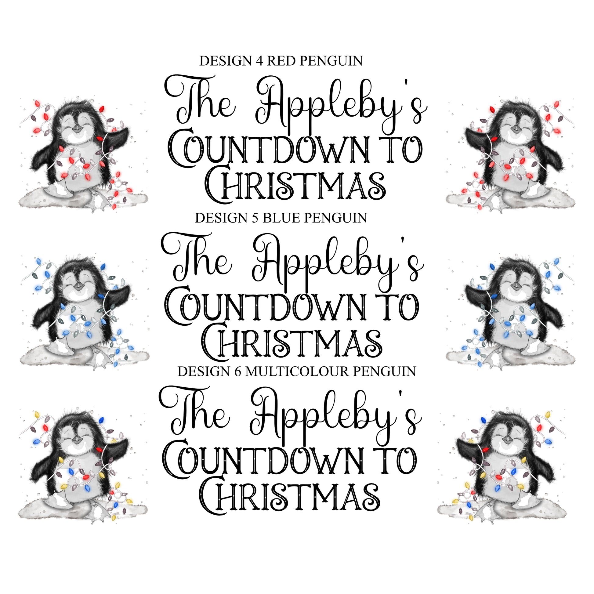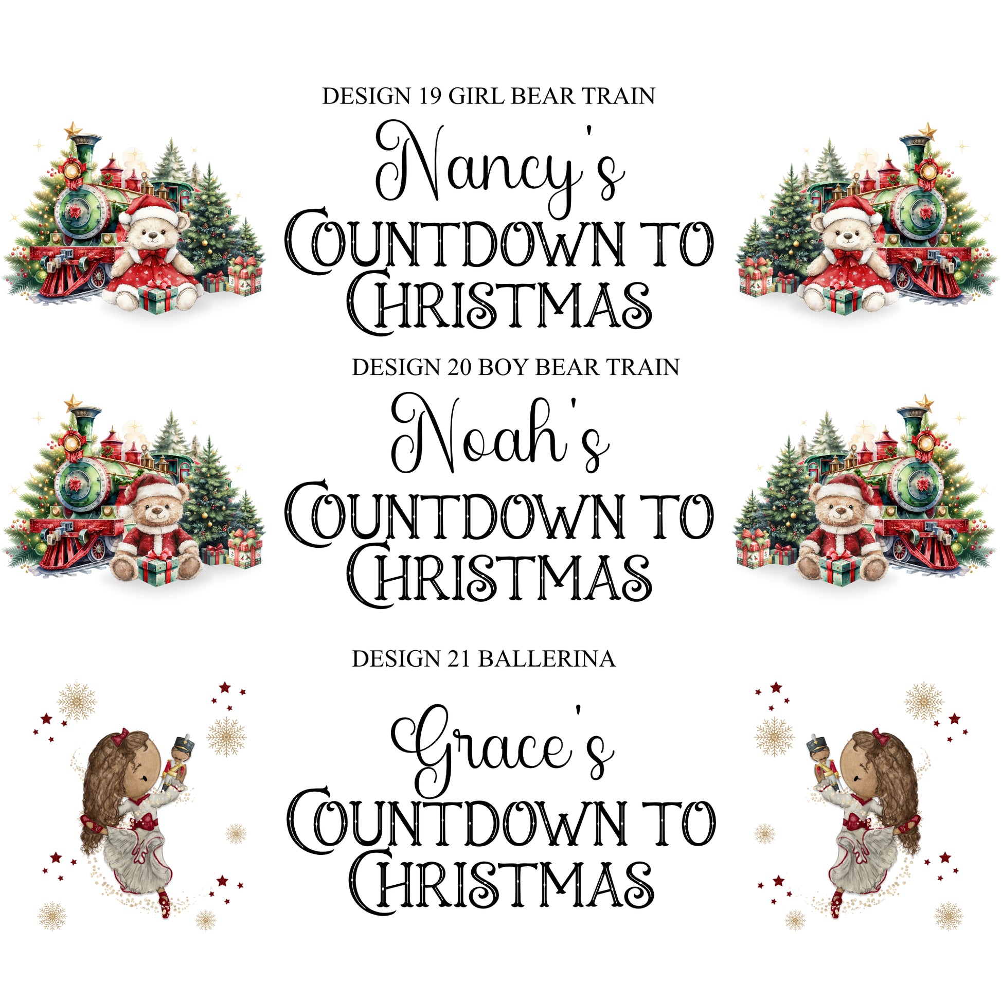 Please enter the wording you would like i.e. The Appleby's Countdown to Christmas or 'Jaxon's Countdown to Christmas' and the design number you would like i.e. Red Truck. You can have any wording here and up to 4 names.