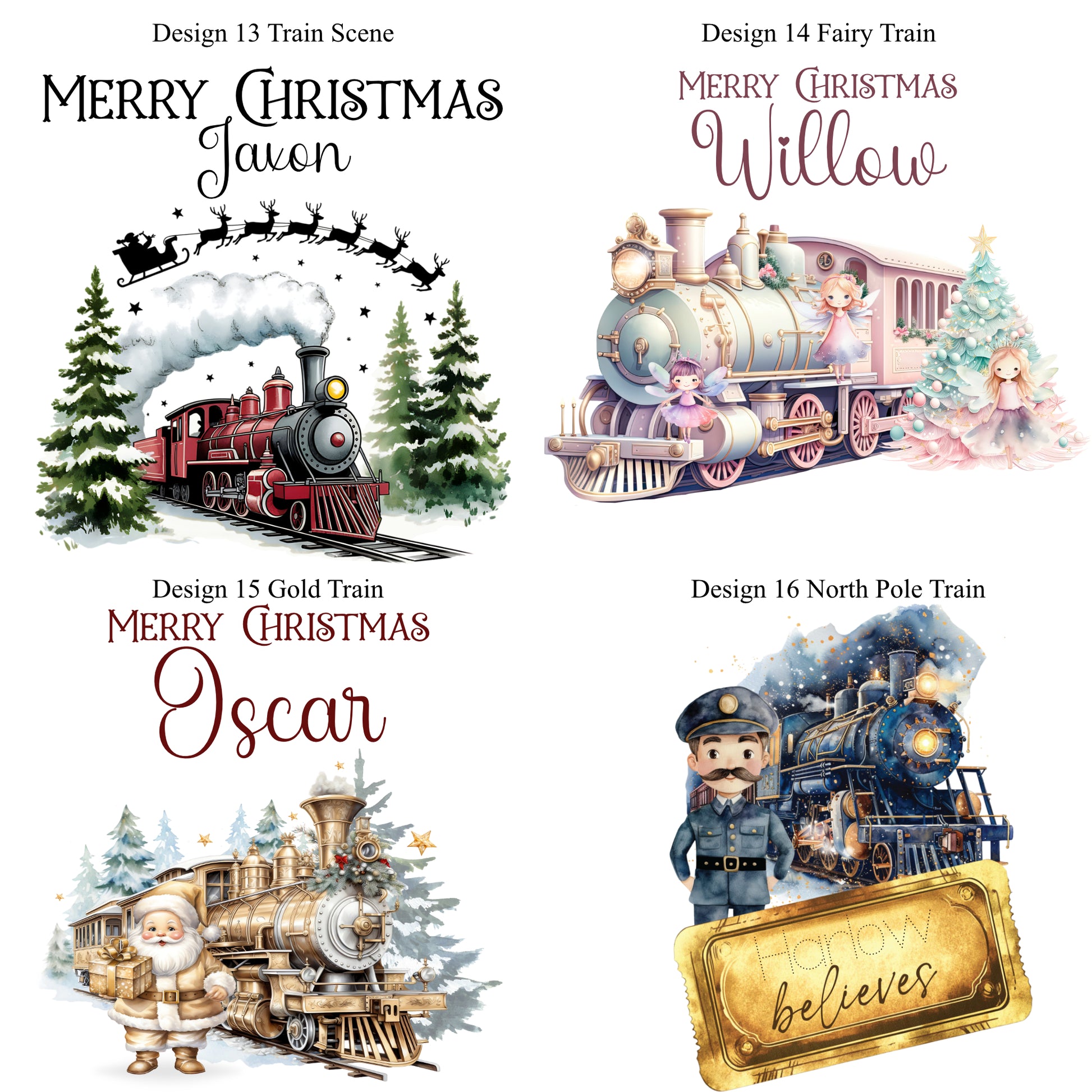 Please enter the wording you would like i.e. 'Merry Christmas Jaxon' and the design number you would like i.e. Red Truck. You can have any wording on these such as First Christmas